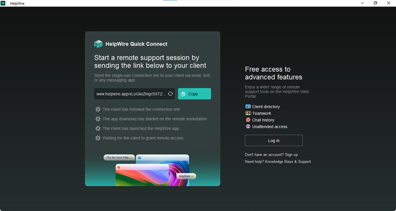 Für einmalige, spontane Support-Sitzungen bietet HelpWire außerdem Quick Connect an. Damit können Sie eine Verbindung starten, ohne sich anzumelden; Sie müssen lediglich einen einmaligen Link mit dem Kunden teilen. Diese Option eignet sich für schnelle, spontane Hilfe, beinhaltet jedoch nicht die fortlaufenden Kundenverwaltungsfunktionen des Webportals. Quick Connect eignet sich am besten für Fälle, in denen Sie sofort eine Verbindung herstellen müssen und keine Kundendaten speichern oder Links später erneut verwenden möchten.